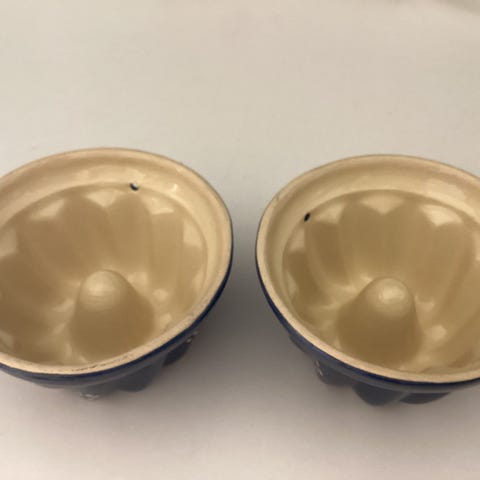 Salt/pebersæt - usigneret, måler H: 9 cm og D: 5.5 cm - pris 49,-, ligesom fede Lille 'æbleskivepande' bruges til lune snegle eller skaller med rå æg - måler H: 4 og D: 15 cm