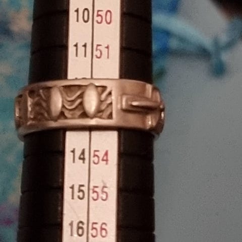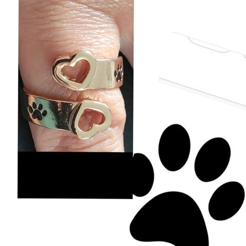 Ringen har et bredt bånd og et motiv med små poteaftryk rundt om hele ringen.