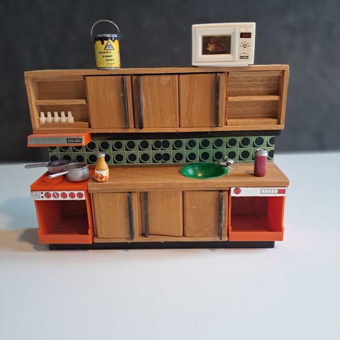 Køkken i 2 elementer med komfur og vask, samt 2 køkkenstole og diverse tilbehør. Vægt 185 g.