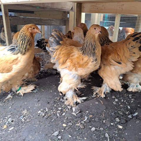 * På billedet ses den brune og de to gule høner samt hanen. De resterende er ikke med i salget.