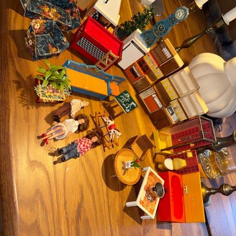 Spisebord med 2 stole, skab og chatol/skænk, tæppe og diverse tilbehør. Den ene stol mangler noget af ryglænet. Vægt 250 g.