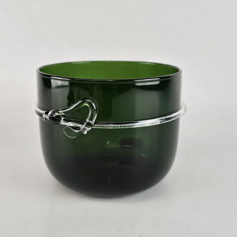 Urtepotteskjuler fra Lyngby eller Holmegaard glasværk. Glasset har en dyb koboltblå farve og en let struktureret overflade.