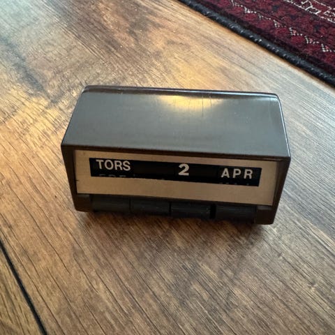 Plumrose evighedskalender fra 1960’erne. Plast med to terningformede klodser til datoangivelse og en sort base med månedsangivelse. Kalenderen har tal og måneder trykt på siderne af klodserne, så datoen kan ændres manuelt dag for dag. Velegnet til skrivebord eller hylde som praktisk datovisning og som enkel borddekoration. (Jeg har også bogen “Fra Drittel til Dåse” fra 1964 fra Plumrose på anden annonce - vist på sidste billede)
