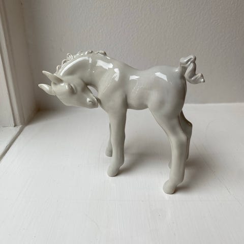 Kongelig porcelænsfigur af designeren Jeanne Glud forestillende en hest med nedbøjet hoved. Figuren er udført i glaseret porcelæn i hvid med grå, plettet bagparti og detaljeret man og hale. Under bunden ses Kongelig porcelæn stempel og modelnummer 2.sortering uden skår. Velegnet som dekoration i reol, vitrineskab eller på hylde sammen med andre porcelænsfigurer.