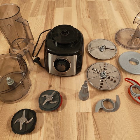 Bosch foodprocessor i hvid plast med transparent skål og låg. Enheden har drejeknap til hastighedsvalg og pulsfunktion. Skålen har måleskala på siden til nem aflæsning af mængder. Maskinen er egnet til hakning, blanding og andre køkkenopgaver afhængigt af de medfølgende tilbehørsdele (ikke specificeret her). Velegnet til almindelige køkkenopgaver i husholdningen.