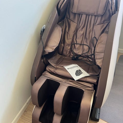 Stolen har fuld liggefunktion og er udstyret med fod- og benmassage, armlæn med indbygget massage og polstret nakkestøtte.