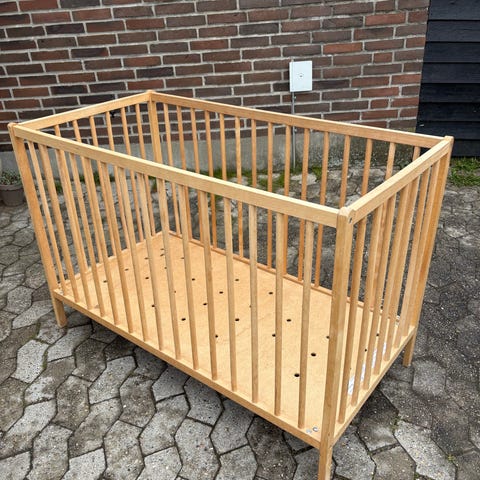Klassisk tremmeseng med lameller hele vejen rundt og fast bund. Inkl. standard madras (mål 60x120 cm). Kan vist kun stilles i én højde (i bunden).