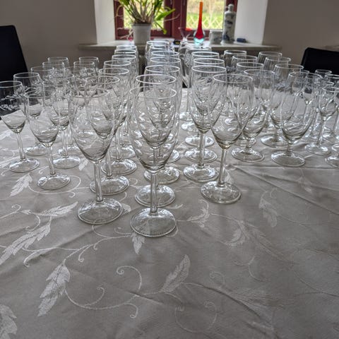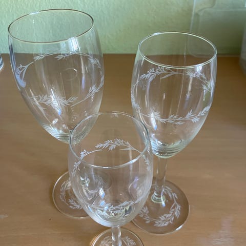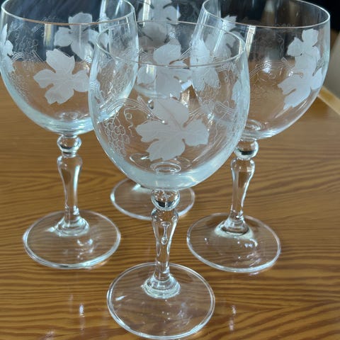Glad med graveret mønster. Glas med stilk og indgraveret bladmønster, velegnet til servering af vin eller andre kolde drikke ved borddækning og hverdag/til særlige lejligheder.