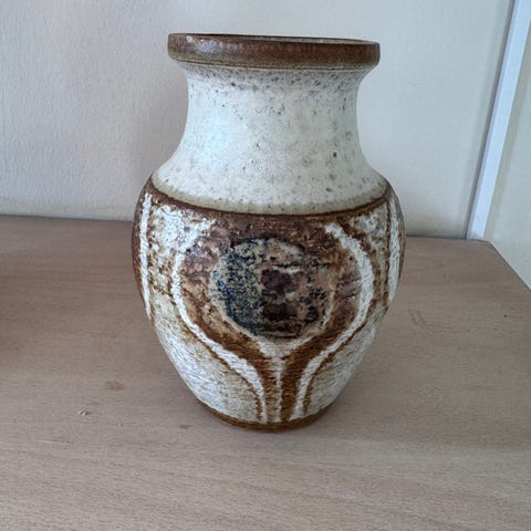 Keramikvase i ukendt mærke med præget stempel i bunden. Vasen er udført i brændt ler med lys, næsten hvid glasur og lodrette brune streger som dekoration hele vejen rundt. Indersiden fremstår i mørkere lerfarve. Formen er rund/oval med smal åbning foroven. Velegnet som lille pyntevase til fx enkelte blomster eller som dekorativt objekt i indretningen.
