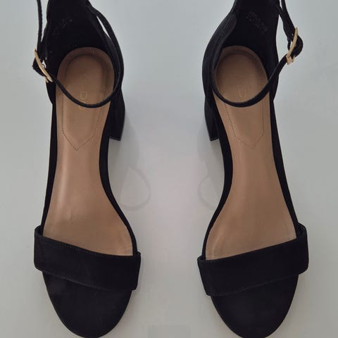 ALDO festsko sandaler i str. 38. Åben tå med bred rem over forfoden og ankelrem med spænde. Blokhæl i matchende sølvfarve. Overdel i sølvfarvet materiale med glat overflade, indersål i lys neutral tone og ydersål i syntetisk materiale.
