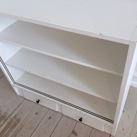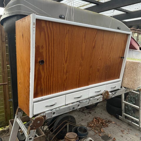 Gammel retro køkkenskab, overskab, københavnerskab med 2 låger, 2 hylder, 3 rum og 3 skuffer. De gamle krom håndtag.
