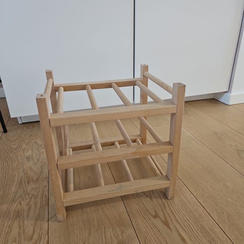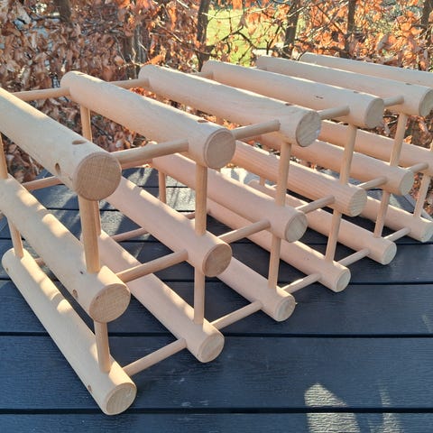 Reolen er fritstående og egner sig til placering på gulv. Konstruktionen består af runde træstave, der danner flere niveauer til flasker liggende. Velegnet til brug i køkken, stue eller vinkælder til organiseret opbevaring af vinflasker.
