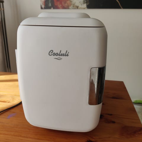 KFO C8AL-6F mini køleskab med kapacitet på 6 liter. Køleskabet er kompakt og egner sig til opbevaring af mindre mængder drikkevarer, snacks eller kosmetik. Indvendigt er der en hylde, som kan tages ud for at tilpasse pladsen. Enheden har ventilationsgitter og tilslutning til strøm på bagsiden. Farven er grøn med kobberfarvede detaljer. Velegnet til brug i f.eks. værelse, kontor eller bil, hvor der er behov for et lille, bærbart køleskab.