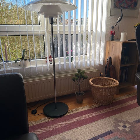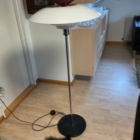 Gulvlampe med rund metalfod og slank, forkromet stander. Lampen har en stor, hvid skærm i kuppelform med mørk topplade. Egnet som belysning i stue, læsehjørne eller andre opholdsrum, hvor der ønskes indirekte og blændfri belysning.