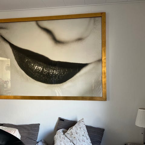Plakat med portræt af kvinde i sort-hvid, monteret i rektangulær guldfarvet ramme. Motivet viser en kvinde i profil med blomster foran ansigtet. Billedet er velegnet som vægdekoration i stue, spisestue eller andre opholdsrum. Ramme og billede fremstår som et samlet vægophæng klar til montering.
