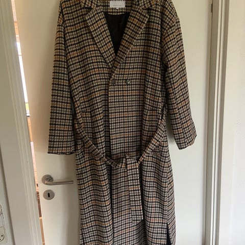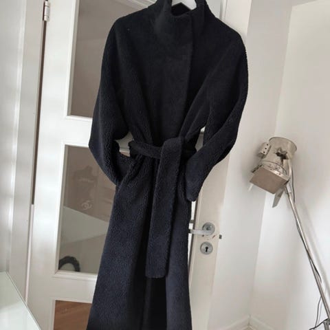 Lang dame frakke i sort farve i størrelse M. Stor, så kan passe str. 40 til 46. Modellen har et løst, rummeligt snit og er lang. Der er trykknapper. Har en kraftig, nopret struktur, som giver et tykt og varmt udtryk. Foret.