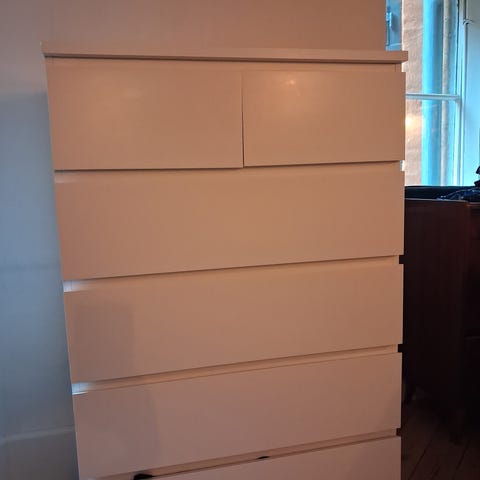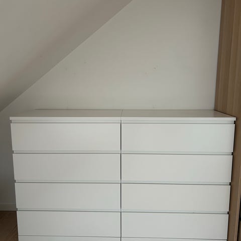Sælger disse to hvide MALM kommoder med 6 skuffer (2 små øverst, 4 store nederst). De fejler intet funktionelt, og skufferne kører perfekt.