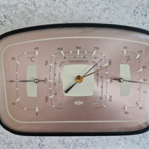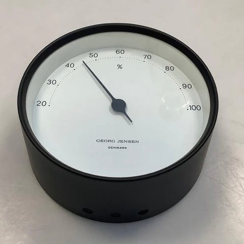 Georg Jensen termometer i et enkelt, rundt design, ø 10 cm. Termometeret har hvid skive med tydelig temperaturangivelse fra ca. -40 til +40 grader celsius og en sort viser. Kanten er i metal, rustfrit stål, med mat finish. Velegnet som del af en vejrstation eller til indendørs brug, hvor man ønsker at aflæse temperaturen. Leveres med original emballage og brugsanvisning til termometer fra Georg Jensen.