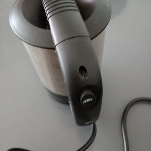 OBH Nordica elkedel i rustfrit stål. Elkedlen har trådløs kande med 360° sokkel og plastikhåndtag. Indersiden er i metal, og låget kan åbnes for påfyldning og rengøring. Der er røget et lille stk. Plastic af (se billede) i bunden af kanden men uden betydning. Ledningsfri. Lidt kalk ved tuden men ellers i fin stand