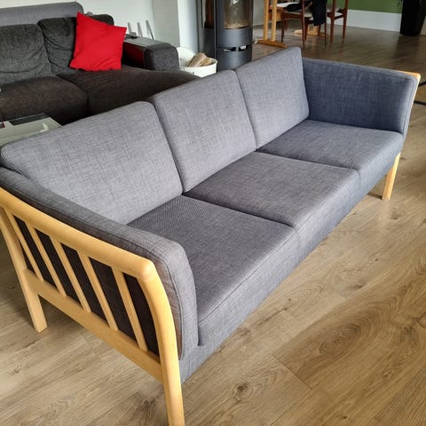 Super lækker 2 personers sofa fra den danske virksomhed Skalma i bøgetræ med sort/koksgrå stof på hynder