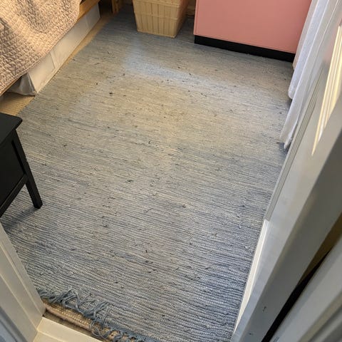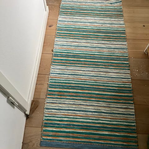 Rigtigt fint lyserødt og hvidt plastik tæppe ukendt mærke mål 120x180