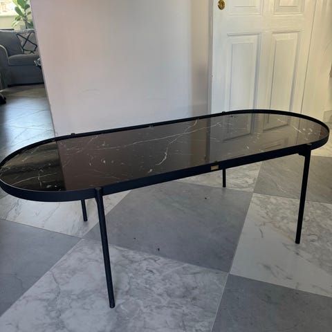 Et super smart og pænt spisebord med hvid marmor look. Glasplade er nem at rengøre og meget praktisk til hverdagsbrug. Messing farve nederst i bunden af stel. Kun få brugsspor under bordet men ikke noget man ser. Står super pænt. Nypris er 5999 kr. Afhentes i Hundested.