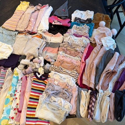 Pakken indeholder bl.a. bodyer, bukser, køredragt og jakke i forskellige farver og styles. Der er mærker som H&M, Wheat, Lindex og Name it