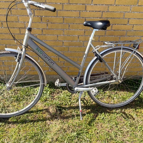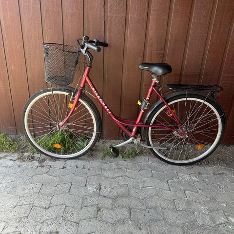 DBS hybridcykel til kvinder med stelstørrelse M og 28" hjul (700c). Cyklen har lav indstigning, fodbremse bagtil og håndbremse foran. Udstyret med kædeskærm, bagagebærer, skærme og støtteben. Farven er rød med lyse detaljer, og sadlen er sort. Velegnet som hverdags- og bycykel til kørsel på asfalt og cykelstier.