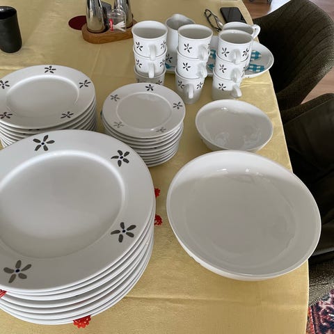 Royal Copenhagen stel med tallerkener og krus i hvid porcelæn med sort dekoration. Sættet består af middagstallerkener, dybe tallerkener og krus i samme design, sort mega og hvid riflet. Velegnet som service til hverdag eller gæster, hvor der ønskes et ensartet udtryk på bordet.