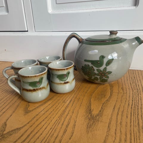 ُEt smuk sæt: med 6 irakisk-iranske teglas med 6 underkopper og 6 skeer, original stil, samt en tekande. Ubrugt.