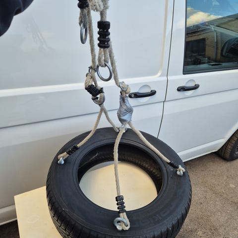 Gynge af bildæk med fastmonterede metalhængsler og reb til ophæng. Velegnet til ophæng i have, på legeplads eller lignende udendørs områder. Kan hænges op i egnet stativ eller kraftig gren med passende kroge eller ophængsbeslag.