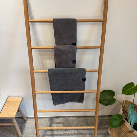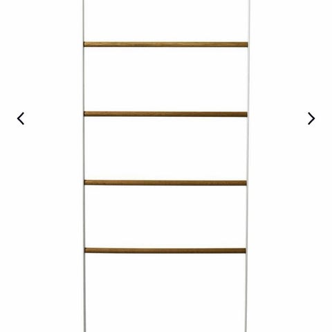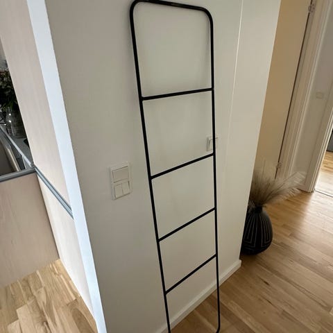 Håndklædestige i sort metal. Stigen har flere tværstænger til ophæng af håndklæder eller tøj og kan lænes op ad væggen på badeværelset eller i andre rum. Velegnet til opbevaring og tørring af håndklæder og tekstiler.