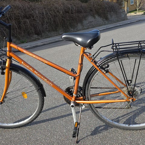 Billigt RETRO - RETRO Nye. To stk. City bike, der har tilhørt familien. Højde på stellet fra krank til stang 48 - 49 cm. Cyklerne har stået i et tørt kælderrum og har stort set aldrig været. Den røde Kildemose har været brugt måske 5 gange og den gule mærket "Spirit of fun" måske 2 gange - til en tur i Århus midtby i solskin. Cyklerne er altså stort set ikke brugte, men er alligevel ca. 15 år gamle på, hvor de i alt den tid har stået opbevaret tørt og sikkert i Århus midt. Rød Kildemose med 7 indvendig Shimano gear - to håndbremser samt fodbremse, og den gule med tre torpedo gear - en håndbremse og fodbremse. Både gear og bremser virker perfekt som nyt på begge cykler - der også kører som var de helt nye. De ses stadig med fedt på gear dele og komplette bremse klodser. Man skal dog påregne at skifte dæk og slanger på begge cykler, da de dele er lige så gamle som cyklerne. 26" dæk/slanger koster ikke ret meget ved feks. Biltema - nogle få hundrede kr. Dæk og slanger er dog noget bedre på den røde Kildemose og kan faktisk bruges. Mekanisk står de som var de nye også i fælge og eger. Der er overhovedet ingen rust, men selvfølgelig kan det ses, at de har stået så længe. De skal lige spændes efter, så er de køreklar feks til sommerhuset, den studerende, arbejdspladsen eller en der bare kan bruge en billig cykel.