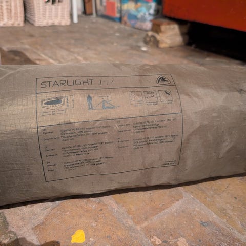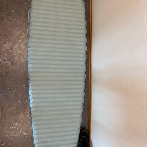 Helt nyt. Ret let, vejer 471 gram i pakkepose på min køkkenvægt i str L med mål 191x61x7 cm. Sælges da det er for tyndt til mig. + 100 kg. Komforten føles faktisk god men jeg rør gulvet når jeg ligger på siden og bevæger mig.