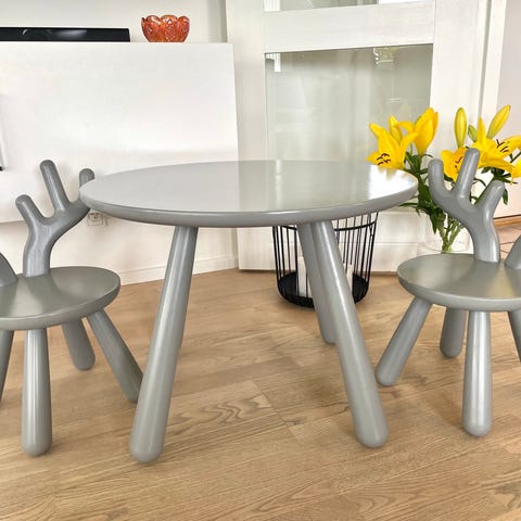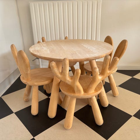 Suuuuuuper nuttet sæt med bord og to stole (én med kaninører og én med gevir) sælges. Men kun fordi mine børn desværre er vokset fra det (piv)