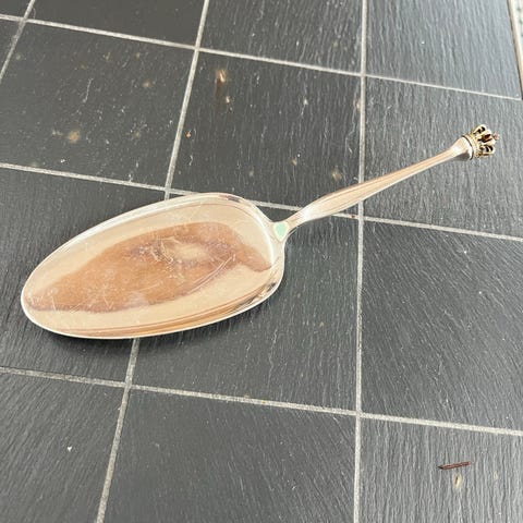 Over 100 år gammel, antik kagespade, forsølvet, med naturligt krummet "blad" af perlemor - changerende i mange nuancer fra sølv til mørk.
