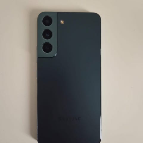 Samsung Galaxy S22 smartphone med 128 GB intern hukommelse. Modellen har et lyst bagsidedesign med tredobbelt kameraopsætning. Fronten har stor touchskærm med frontkamera i skærmen. Egnet til almindelig brug som opkald, beskeder, internet, apps og medielagring.