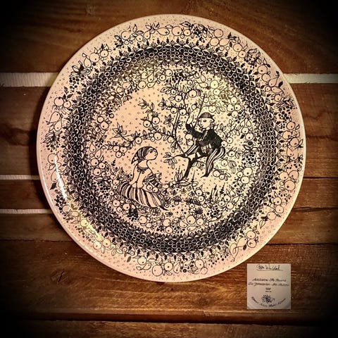 Smukt og dekorativt Bjørn Wiinblad fad fra serien "Årstiderne". Fadet måler hele 37 cm i diameter og er et fantastisk blikfang – perfekt til både vægophæng eller som centerpiece på bordet.