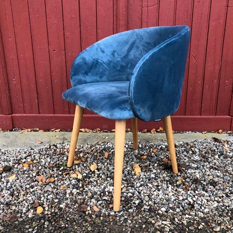 Stolen har en dyb blå velourbetræk og træben, med et moderne og minimalistisk design. Pris 500 kr. stk.- Bemærk at mail, chat og beskeder ikke besvares, og varen skal købes på knappen "Gå til varen". Efter reservering af varen har du 10 dage til at afhente den i den butik, varen er på lager i.