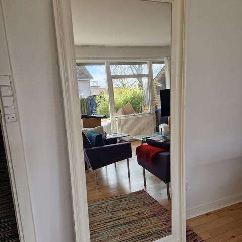 160 cm høj og 80 cm bred. Træramme, trænger til let puds og maling.