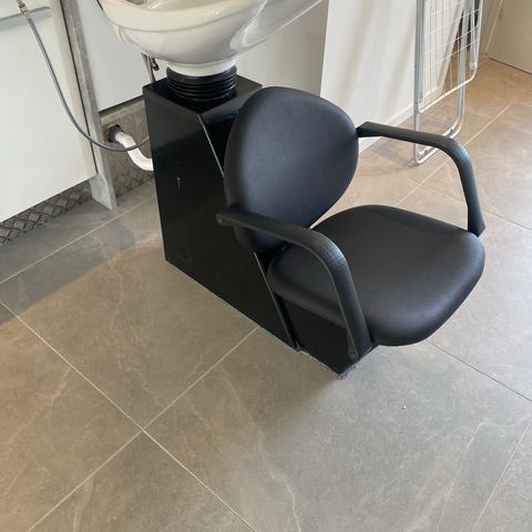 Komplet frisørsalon sælges samlet - bestående af blandt andet vaskeplads med integreret vask og stol samt flere frisørstole i sort polstring og med armlæn.