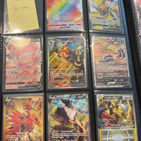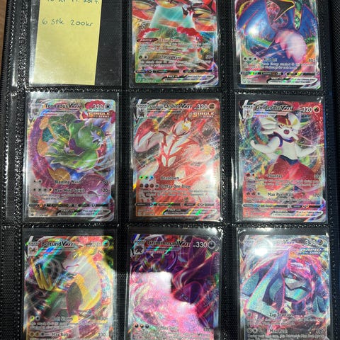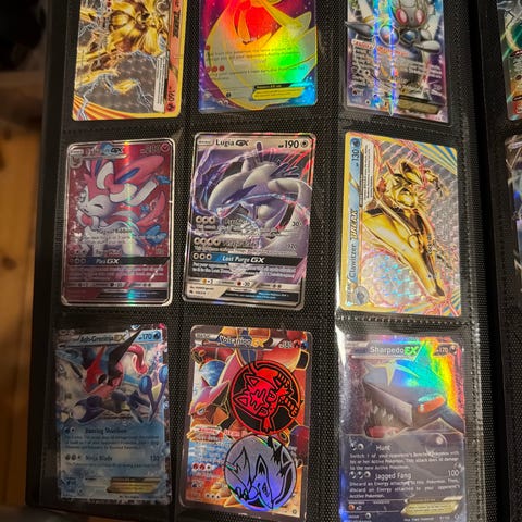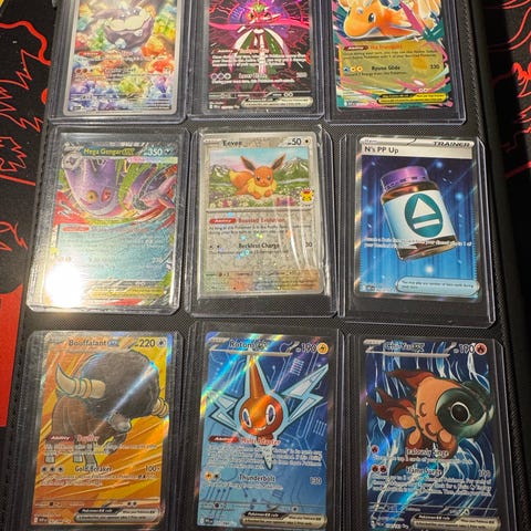 Pokémon samlekort i mappe med blandede kort. Kortene ligger i plastlommer og omfatter forskellige motiver og typer, herunder flere holo- og fuldartkort. Velegnet til samlere af Pokémon TCG, som ønsker en samlet mappe med forskellige kort fra flere sæt og serier.