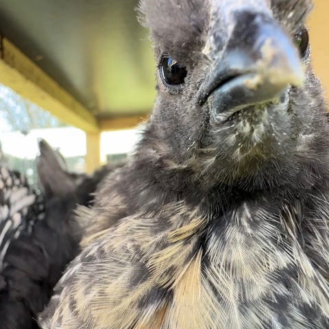 En skøn og rolig silkehane, med grå, hvid, sort spættet blød og pjusket fjerdragt. Hans far har været en meget aktiv hane og fået mange kyllinger.