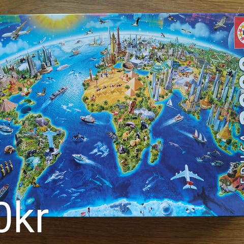Educa World Map puslespil med 2000 brikker. Motiv af verdenskort med kontinenter, byer, bygninger, skibe og fly.