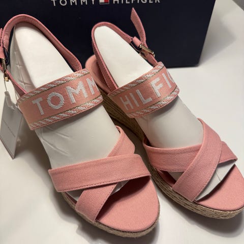 Tommy Hilfiger sandaler med kilehæl i str. 38. Sandalerne har hvid rem-overdel og flettet sål med kilehæl. Åben tå og ankelrem med spænde. Velegnet som sommersandal til hverdagsbrug eller mere pæne anledninger.