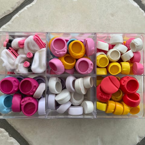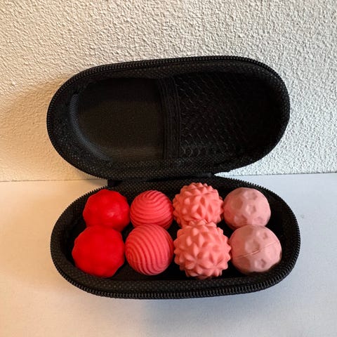 Magnetiske Fidget kugler sæt med etui i røde nuancer. Sættet består af små kugler med forskellige overflader, blandt andet rillede, piggede og knudrede strukturer. Kuglerne er beregnet til at ligge i hånden og kan bruges til fingertræning, taktil stimulering og koncentrationsøvelser. Medfølgende hårdt etui med lynlås gør det muligt at opbevare og transportere kuglerne samlet.