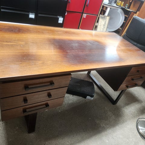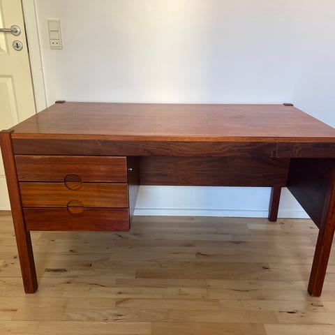 Smukt skrivebord i mahogni, designet af Henning Jensen og Torben Valeur for Munch Møbler. Tre svævende skuffer og smukke sammenføjninger. Brugsspor men ellers pæn stand. M-40 serien.