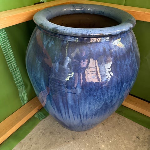 Keramik krukken er udført i en fin blå farve, der vil stå flot i mange havemiljøer og på terrasser.