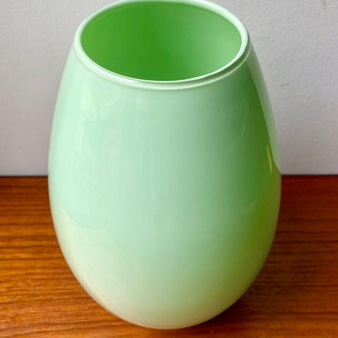 Skål eller urtepotte af sart lysegrønt mundblæst glas, fra Holmegaard i serien Quadro Art Glas, designet af Peter Svarrer i 1998. Skålen står i rigtig pæn stand uden skår og uden afslgg på kanterne. Minimal overfladisk slid.