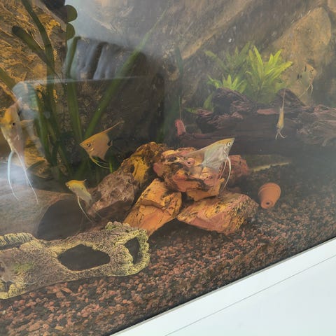 Akvarium Juvel incl alt udstyr i hjørnemodel med buet front og tilhørende hvidt underskab med opbevaringsplads. Akvariet er udstyret med baggrundsdekoration og beplantning i bunden. Egnet til indendørs brug til hold af fisk og akvatiske planter. Skabet giver plads til opbevaring af tilbehør som foder, pumper og rengøringsudstyr. Velegnet til placering i et hjørne for pladsbesparende indretning.